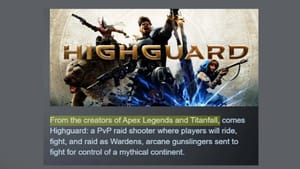 Kotaku reports that on January 26, Highguard removed references to Titanfall and Apex Legends from the game’s Steam store page, a change made on the shooter’s PC and console launch day. SteamDB documented that the original Steam description — "From the creators of Apex Legends and Titanfall, comes Highguard: a PvP raid shooter where players will ride, fight, and raid as Wardens, arcane gunslingers sent to fight for control of a mythical continent" — was edited to remove all mention of Titanfall and its spin-off, leaving only: "Highguard is a PvP raid shooter where players will ride, fight, and raid as Wardens, arcane gunslingers sent to fight for control of a mythical continent." The game was first presented in December at the Game Awards, where Geoff Keighley said, "Our final world premiere comes from 61 members of the team that built Apex Legends and Titanfall.