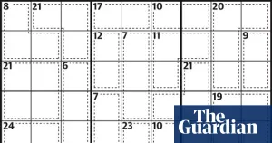 Normal sudoku rules apply, except the numbers in the cells contained within dotted lines add up to the figures in the corner. No number can be repeated within each shape formed by dotted lines.