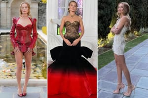 On Los Angeles press dates she posted feathered Victoria Beckham spring 2026 looks captioned with a passage about her character tearing apart pillows, then wore a crimson Dilara Findikoglu corseted jacket and micro-miniskirt with python pumps and a red choker. She later changed into a Markgong nightie‑inspired layered dress with pink ribbons and slashed leather knee-high boots.