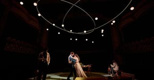 The production pairs modern characters Hannah Jarvis (Leila Farzad) and Bernard Nightingale (Prasanna Puwanarajah) with 1809 figures including Lady Croom (Fiona Button), Thomasina (Isis Hainsworth) and Septimus Hodge (Seamus Dillane). Alex Earles’s in-the-round set centers on a revolving desk patterned with concentric circles beneath a constellation of illuminated orbs.